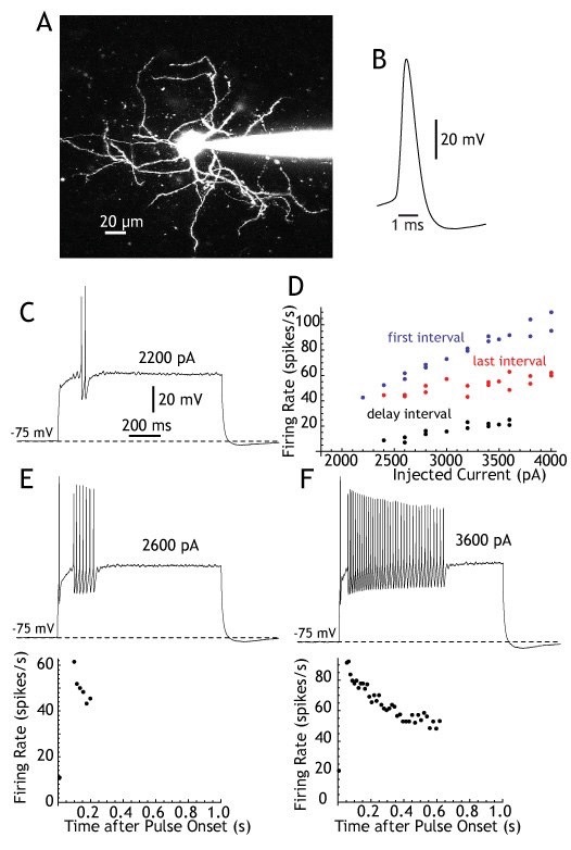 A. Candidate FS cells were identified by their characteristic morphology after intracellular staining with Alexa Fluor 594. B. Typical appearance of the FS cell action potential. FS cells' action potentials were brief with a large but short duration AHP. C. At rheobase currents, FS cells typically fired a single doublet of action potentials, preceded by subthreshold oscillations. D. Frequency-Intensity curve for the cell shown in C,E and F. Delay interval is the interval between the early first action potential and the beginning of the burst, for current levels that produced an early spike. First and last intervals refer to the first and last interspike interval in the burst. E and F. Suprathreshold firing of the same cell in C and D, showing the early spike, delay interval, and burst. Below each trace is the instantaneous firing rate calculated for each interval. The minimum firing rate, as seen in trace C, is approximately equal to the firing rate at which firing fails at the end of the burst.
