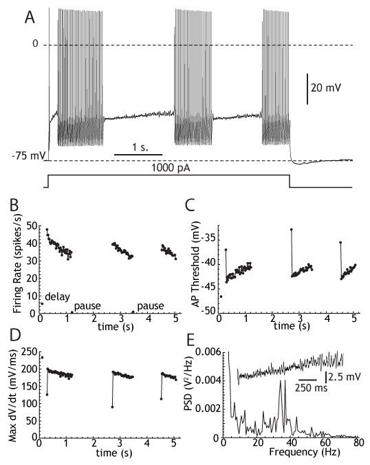 A. Firing of a striatal FS cell in response to a 5 s current pulse. Bursts occur at irregular intervals, and are separated by periods of prolonged depolarization with subthreshold oscillations. The first action potential in each burst is lower amplitude than the others. The termination of the current pulse is followed by a long lasting afterhyperpolarization. B. Instantaneous firing rate. Rates for intervals within a burst are connected by lines. Firing rate is elevated at the beginning of each burst and decays to approximately the same failure point for each burst. C. Action potential threshold plotted in the same way as B. Note the elevated threshold of the first action potential in each burst. D. Maximum rate of rise of the action potentials. Note parallel evolution of threshold and rate of rise throughout the burst. E. Frequency spectrum of subthreshold oscillations during the pauses. The peak of the spectrum corresponds to the minimum firing rate. The inset shows an example inter-burst membrane potential trajectory.