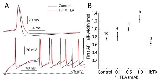 A. Increase in action potential duration, reduction in slope of the falling phase of the action potential, and decrease in the early single spike afterhyperpolarization after 1 mM TEA. Note lack of a change in the initial membrane potential preceding the first action potential, or in duration of delay preceding the burst, or action potential threshold or firing pattern during the burst. B. Dose dependent effect of TEA on action potential duration, as measured by half-width. Iberiotoxin (ibTX, 50 nM) had no effect on action potential duration, suggesting the absence of a contribution from BK channels. Number of cells tested is indicated above each point.
