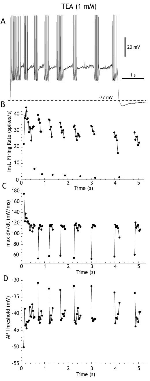 A. An example showing stuttering firing of a striatal FS cell after application of TEA. Subthreshold oscillations between bursts and the long lasting afterhyperpolarization at the end of a 5 s pulse continue to be evident. B. Instantaneous firing rate during the current pulse shown in A. C. Maximum rate of rise of action potentials. D. Threshold voltage for action potential generation. None of these measures were altered by 1 mM TEA treatment, despite the change in action potential duration and single-spike AHP amplitude.