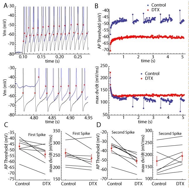 A. Initial firing (top trace) and onset of the last burst (bottom trace) from the same data shown in Figure 5. Action potential threshold is indicated by red dots. Note large negative shift in threshold in DTX trace (black). The elevated threshold for the first action potential in the control burst is in addition to this shift. B. Action potential threshold (top) and maximum action potential rate of rise (bottom) for every action potential in both long traces shown in Fig. 5. C. Threshold shifts and maximum action potential rate of rise for the first action potential in sample of 8 cells treated with DTX. Lines represent individual cells, averaged over traces at all current levels. Red horizontal lines are medians. D. Threshold and maximum rate of rise of the action potential for the second action potentials. Note consistent difference in threshold but not in maximum rate of rise of action potentials.
