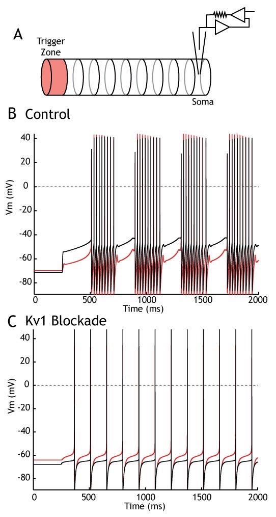 A. Steady state I-V curve as measured using a 1 s voltage ramp from -80 to -40 mV. When Kv1 conductance is intact (3 mS/cm2), the curve is monotonic. For interspike intervals comparable to the duration of the ramp, outward currents exceed inward ones and firing at this rate is impossible. Firing in this case (class 2 excitability) only occurs when the voltage changes more quickly, so that kinetic differences between inward and outward currents can favor regenerative depolarization. Blockade of Kv1, removes an outward current in the -60 to -45 mV range of membrane potentials and creates a negative conductance region. Addition of a small constant current (red line, iapp=0.85), causes the loss of the subthreshold equilibrium potential and firing can occur. Firing will slow asymptotically as the I-V curve nears the 0 current line, allowing firing at arbitrarily low rates. B. Response of the model to a 2.5 µA/cm2 current with Kv1 current at 3 mS/cm2. B. Response to a near-rheobase current (0.85 µA/cm2) in the absence of Kv1 current.