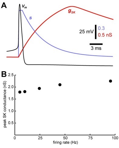 A, Time course of Ca2+ sensor activation (blue trace) and active SK conductance (red trace) in relation to the action potential (black trace). B, Peak SK conductance achieved as a function of firing rate in the model. The firing rate was controlled by application of DC current (-7 pA, 16 pA, 80 pA, 160 pA, and 350 pA).