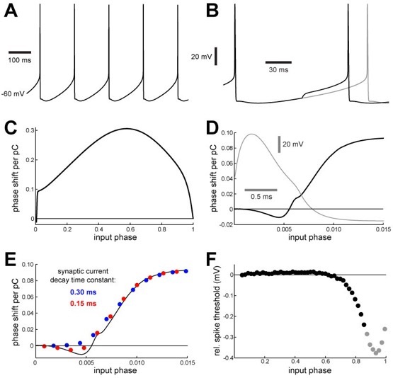 A, Autonomous activity generated by the model. B, Response of the model to a synaptic current waveform (black trace). [peak current, decay t.c., EPSP ampl] The gray trace shows the membrane potential trajectory of the model in the absence of input. C, iPRC of the model. D, Detail of the iPRC at very early input phases (black curve) plotted with the membrane potential trajectory (gray trace) on the same horizontal scale. Note that the oscillation cycle begins (and ends) during the action potential's rising phase, where the rate of rise is maximal, not at the action potential peak. E, Normalized phase shift induced by brief synaptic current waveforms at very early phases. The synaptic currents decayed with time constants of 0.3 ms (blue circles) and 0.15 ms (red circles). [EPSP ampl, peak current] The black curve shows the iPRC. F, Threshold of the first poststimulus spike relative to the threshold of spontaneous spikes, plotted as a function of input phase. Gray circles denote trials on which the spike was triggered less than 10 ms after EPSP onset, before the synaptic current waveform had decayed to zero.