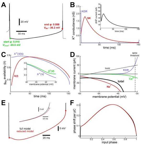 A, Selection of a cycle segment that excludes the spike. The black trace shows the voltage trajectory of one complete oscillation cycle; the gray trace shows the continuation of that trajectory into the preceding and succeeding cycles. The green circle marks the beginning of the spike-free segment, 2.29 ms after the start of the cycle; the membrane potential at that point becomes the resetting potential. The red circle marks the point where the membrane potential crosses spike threshold, defining the end of the segment. B, Model AHP. The K+ delayed rectifier (blue) and SK (red) conductances are plotted as a function of time since the beginning of the cycle, starting at the resetting time (2.29 ms). The sum of the KDR conductance in the first 30 ms of the cycle and the SK conductance of the entire cycle (starting at the resetting time and ending at threshold crossing) is defined as the AHP conductance; note that this excludes the small KDR activation that occurs just before spike threshold is crossed. Inset, the AHP current resulting from this conductance. C, Treatment of the Na+ inactivation gating variable, h. The actual trajectory h(t) (red) differs considerably from the steady-state value of h (blue) determined by the membrane potential trajectory V(t). To deal with this issue, we use the trajectories h(t) and V(t) for t > 52 ms to define h(V) for V > -66 mv (inset, green curve). D, Non-AHP membrane currents plotted as a function of membrane potential, assuming that all gating variables save h remain at their steady-state values; h is given by the modified function h*(V). The Na+ current (red) combines the persistent and inactivating Na+ conductances, but the visible part of the curve is dominated by the persistent Na+ current. The thick black curve plots the sum of all non-AHP membrane currents. E, Spontaneous membrane potential trajectory of the full model (black) and reduced model (red). Inset, detail of the trajectories as they approach spike threshold, showing a very small deviation. F, iPRCs of the full model (black) and reduced model (red). Obviously, the reduced model iPRC is only defined over 0.015 ≤ ϕ ≤ 0.998.