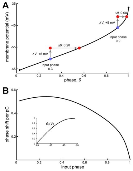 A, Voltage trajectory generated by the reduced model without AHP currents. It is expressed as a function of phase, as defined by the shortened period of the model without the AHP: phase θ = t/T1. This illustrates the relationship between the PRC and the voltage trajectory in this model. Blue circles show the state just prior to stimulation at two distinct input phases (θ = 0.3 or 0.9) and red circles show the state immediately after stimulation, assuming that the stimulus current is a delta function that causes an instantaneous change in the membrane potential. B, iPRC of the reduced model without AHP currents. Inset, phase θ as a function of membrane potential.