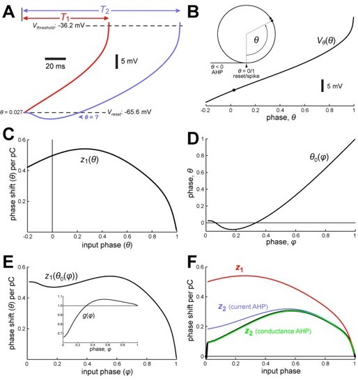 A, Voltage trajectories generated by the reduced model without AHP currents (red trace) and with AHP currents (blue trace). The lower dashed line marks the postspike resetting potential, corresponding to a phase (θ) of 0.027 in the AHP-free model, the minimum phase for which the relationship between V and θ is initially defined. The AHP currents pull the membrane potential below this level, into a region where θ is not defined. The upper dashed line marks the spike threshold. Note that the phase θ at Vreset is not the same as the resetting phase in model's natural phase coordinate (ϕ = 0.015), because the period has changed (from T2 with AHP currents intact to T1 in the absence of the AHP) while treset remains fixed at 2.29 ms. B, Extension of the phase model to include θ < 0.027. Phase θ for V < Vreset can be defined by integrating Equation 1 (with gAHP(t) = 0) backwards in time from (treset, Vreset) and dividing time by T1. The resulting function Vθ(θ) is shown in the main panel and covers the full voltage range encountered during the AHP and beyond; the black circle marks the starting point for integration at θ = 0.027 / treset = 2.29 ms. This extension alters the structure of the phase model's state space, shown schematically in the inset. Accessible states are no longer limited to the circle, and if a hyperpolarizing input pushes θ below zero (strictly speaking, below the resetting θ of 0.027), the model enters a range of θ corresponding to V < Vreset rather than looping back into late phase states. C, The AHP-free iPRC, extended to deal with the AHP current. D, Trajectory of the AHP-free phase variable θ as a function of the natural phase variable ϕ when the AHP is present. E, Value of z1 as a function of ϕ as the AHP current sweeps θ through the range of values shown in panel D. Inset shows the indirect effect of the interaction between AHP currents and the IV-defined iPRC z1, given by equation 8. F, Predicted iPRCs of the reduced model without the AHP (red curve) and with the AHP (green curve), compared to the iPRC of the full model (thick black curve).