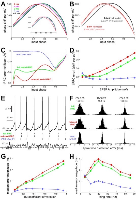 A, Normalized PRCs generated by the full STN model using EPSPs of varying amplitude. EPSPs were driven by synaptic current waveforms with a decay time constant of 1 ms. Inset, normalized synaptic PRCs generated by a phase model using the iPRC shown in Fig. 2C, D. EPSPs are the same as in the main panel. B, Comparison of normalized synaptic PRCs generated using large (8 mV) and small (0.5 mV) EPSPs in the full model and the phase model (subset of data plotted in panel A). Normalized PRCs of the full model are shown in red (large EPSP) and black (small EPSP); those of the phase model are shown in light red (large EPSP) and gray (small EPSP). C, Difference between the normalized synaptic PRC generated by the full model and those generated by three different phase models, using 8 mV EPSPs. This difference, the "iPRC error," is shown for the iPRC of Fig. 2C, D (green curve, "full model iPRC," also used in panels A and B of this figure), the iPRC of the reduced model, given by equation 9 (red curve), and the IV-derived iPRC with an applied AHP conductance (blue curve). D, Absolute value of the iPRC error averaged over input phase, plotted as a function of the size of the EPSP used to generate normalized synaptic PRCs. E, Models driven by a noisy current waveform. Top, voltage trace generated by the full model. Middle, rasters showing spike times predicted by each of the three phase models. Bottom, current applied to the models. F, Histograms of the spike time prediction error for the full model iPRC (top row), reduced model iPRC (middle row), and applied AHP model (bottom row), when driven by current waveforms with standard deviations of 10 pA (left column), 50 pA (center column), and 125 pA (right column); the mean current was +40 pA in all cases. Changing the current standard deviation changed the CV of the ISI distribution while leaving the firing rate largely (but not entirely) unchanged. Note the change in time scale across columns. G, Median magnitude of spike time prediction error plotted as a function of CV, for the full model iPRC (green), the reduced model iPRC (red), and the applied AHP model (blue). CV was varied by changing the applied current standard deviation from a minimum of 10 pA to a maximum of 250 pA while the mean current level was held constant at +40 pA. The mean firing rate varied from 15.1 Hz to 18.6 Hz. H, Median magnitude of spike time prediction error plotted as a function of mean firing rate, for the full model iPRC (green), the reduced model iPRC (red), and the applied AHP model (blue). The firing rate was varied by changing the mean current from a minimum of -10 pA to a maximum of +200 pA while the standard deviation was held constant at +50 pA. The CV also changed considerably as the mean current level was altered, ranging from 0.16 (+200 pA) to 0.46 (-10 pA). However, the CV at a mean current of -10 pA was something of an outlier; the CV at the next mean level tested (+20 pA) was 0.29 and continued to decline as the mean current increased.