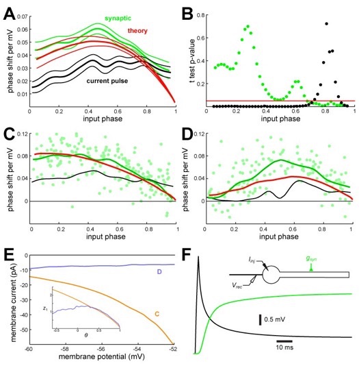 A, Synaptic (green), current pulse (black), and theoretically predicted (red) normalized PRCs. Thick lines are average PRCs, thin lines show mean ± SEM. The theoretically predicted curves were generated by simulating the response to the measured synaptic current waveform for each cell using its theoretically predicted iPRC, z2(ϕ), and normalizing by EPSP size. These predicted normalized synaptic PRCs differ only slightly from the iPRCs (z2) themselves, when expressed in the same units. The sample for synaptic and theoretically predicted PRCs included 11 cells; current pulse PRCs were obtained in a subset of these cells (n = 9). B, Probability of type I error when testing the null hypothesis that the average synaptic (green circles) or current pulse (black circles) PRC is equal to the average theoretically predicted PRC, using paired t tests. The red line marks the p = 0.05 criterion level. The current pulse PRCs were tested against theoretically predicted current pulse PRCs, not the theoretically predicted synaptic PRCs shown in panel A (although the difference between the two predictions was very small). C, Synaptic (green), current pulse (black), and theoretically predicted (red) normalized PRCs of an example cell. D, As in C, but from a different cell. E, Hyperpolarized region of the IV curves of the cells shown in panels C (orange curve) and D (blue curve). Inset, AHP-free iPRCs (z1) derived from these IV curves. The AHP-free iPRC of the cell shown in C (orange curve) is multiplied by 0.5 so that the two iPRCs can be more easily compared in the same plot. F, Simulated voltage trajectory measured in the axon (50 μm from the soma) following somatic current injection (black trace; 2 ms, +50 pA) or a synaptic conductance change (green trace; alpha function with 1 ms time constant, 2 nS peak conductance, 0 mV reversal potential) occurring halfway down the length of the dendrite.