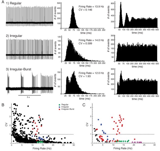 A, Examples of the range of LTS interneuron firing patterns encountered from cell-attached recordings (10 min samples). Columns are (from left to right) sample of inverted voltage clamp recording of autonomous firing, interspike interval (ISI) histogram, and autocorrelogram (Bin width = 1 ms). Firing rates and CVs shown in middle columns are mean values taken from the full 10 min samples. Regular firing (A1) displayed a unimodal Gaussian distribution in the ISI histogram and multiple evenly spaced peaks in the autocorrelogram. Irregular firing (A2) exhibited a unimodal skewed distribution in the ISI histogram and no clear peak in the autocorrelogram. Irregular-Burst firing (A3) alternated between an irregular firing pattern and a bursting pattern, which produced a bi-modal distribution in the ISI histogram and two distinct peaks in the autocorrelogram. B, Population graph displaying mean CV versus mean firing rate for all 60 s samples of cell-attached activity. Dotted line corresponds to Poisson firing (CV = 1). Green circles correspond to LTS interneuron illustrated in A1. Blue circles correspond to LTS interneuron illustrated in A2. Red circles correspond to the LTS interneuron illustrated in A3. C, Graph of mean CV versus mean firing rate for five LTS interneurons each labeled by color displaying their entire recorded activity divided into 60 s samples.