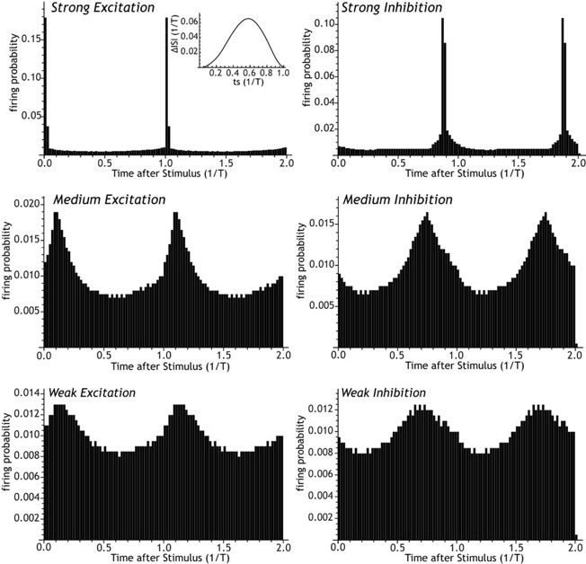 Post stimulus histograms calculated for excitatory and inhibitory phase resetting using an idealized GP-like phase-resetting curve (inset). The strength and the phase of resetting produced by stimulation depends on stimulus intensity. For weak stimuli, excitatory and inhibitory stimuli reset to diametrically opposite phases, but at high stimulus levels, they approach the same phase. There is no threshold for the phase resetting effect of synaptic input.