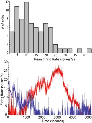 Top: Distribution of firing rates for 3 min samples of activity in GPe neurons recorded in rat slices. Note the broad range of firing rates. Bottom: A pair of GPe neurons recorded simultaneously, showing independent spontaneous wander of firing rates over nearly the entire range seen in the histogram.