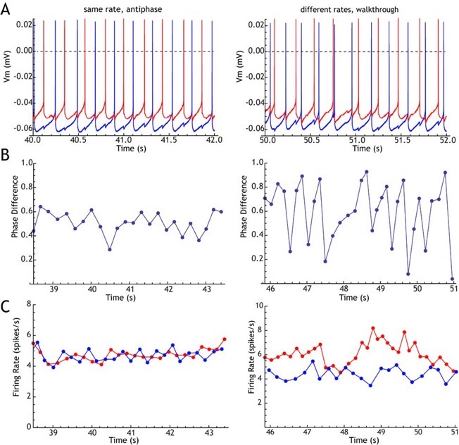 A pair of neurons recorded simultaneously in a slice was coupled by reciprocal GABAA-like synaptic connections. The rates were controlled by passing constant current, to be approximately equal (left column) or to differ by about 30% (right column). A. Example traces showing stable antiphase firing with equal rates, and phase-walkthrough when rates differ (the faster cell advances phase relative to the slower one). B. Evolution of phase difference between the two cells. C. Instantaneous firing rates for the two cells.