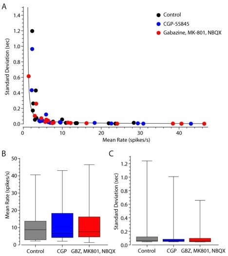 A: plot of SD of ISIs plotted as a function of mean firing rate for cells recorded in control artificial cerebrospinal fluid (black dots), CGP-55845 (blue dots), and a cocktail of gabazine (GBZ), MK-801, and NBQX (red dots). Solid continuous line is the same hyperbolic function plotted in Fig. 1. B: sample distributions of mean firing rates across conditions. C: sample distributions of standard deviation in ISIs across conditions.