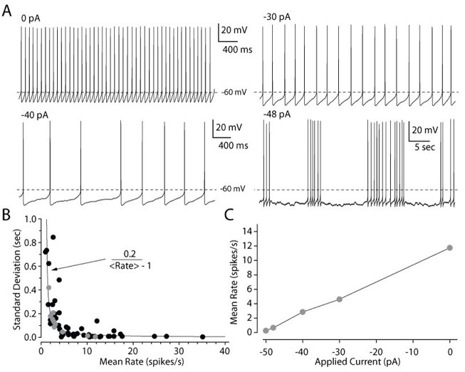 A. Portions of spike trains recorded from an example GPe neuron recorded in the perforated patch configuration with varying amplitudes of hyperpolarizing current injections. Note the significantly different time-scale for the -48 pA current injection. B. Frequency-current relationship for the neuron in A. C. Plot of σ of intervals against mean firing rate, along with the same hyperbolic function shown in Figures 1&2, for the neuron shown in A. Current injection amplitude is denoted above each symbol. Inset shows the compiled results from 13 neurons subjected to hyperpolarizing current injections.
