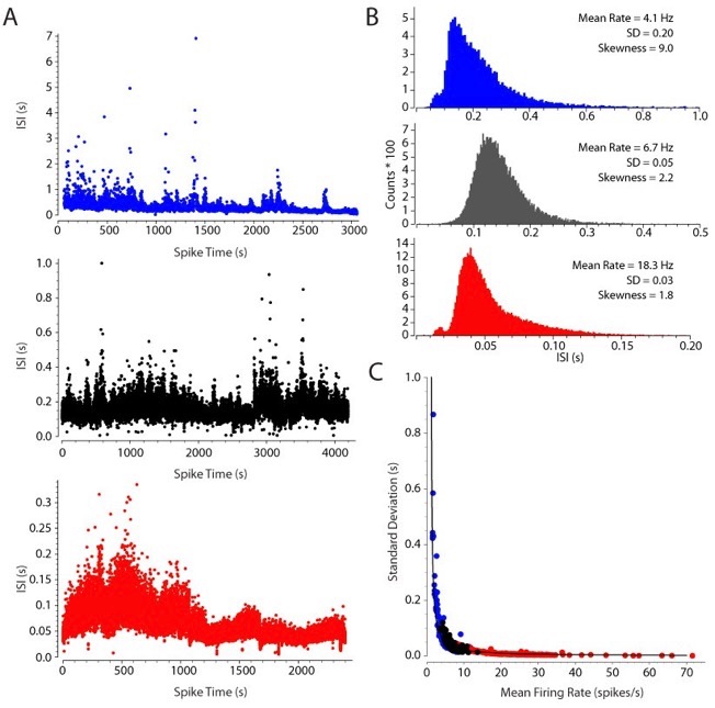 A. ISI plotted as a function of spike time for three examples cell-attached recordings from long duration (35-90 min) recordings. The examples were chosen to represent the range of firing rates observed. B. ISI histograms for the three examples shown in A, and color coded in the same way. C. Plot of SD against mean firing rate for the three examples shown in A. Each point represents the SD and mean firing rate calculated in a bin of 100 adjacent spikes.