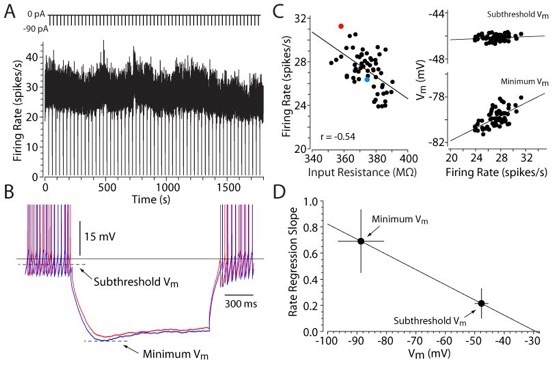 A. Neurons were recorded in current clamp and allowed to fire spontaneously. Every 30 seconds a hyperpolarizing current was injected for 1.5 seconds. Instantaneous firing rate is plotted as a function of spike time for this example cell. B. Portions of the 30 minute voltage trace showing the neuron’s response to hyperpolarization for two different mean firing rates. Spikes are truncated by ~10 mV. The mean subthreshold Vm and minimum Vm were used to calculate input resistance. C. Left, average firing rate was calculated for 100 spikes preceding each current injection and correlated with the neuron’s input resistance. For this example, the correlation coefficient (r) was -0.54 (p < 0.0005). The blue and red dots correspond to the blue and red traces shown in B. Right, subthreshold Vm and minimum Vm were plotted as a function of firing rate to determine which component showed more covariation with firing rate. Each component was fit with the best linear fit. In this example, the subthreshold Vm vs. rate plot had a slope of 0.02, and the r was 0.15 (p > 0.2). The slope value for minimum Vm plotted with rate was 0.28, and the r was 0.61 (p < 0.00005). D. Mean regression slope values, as in C, for our sample (n = 6). The regression slope for minimum Vm was significantly higher than of the subthreshold Vm (p < 0.05). Extrapolation of the best fit line predicts a reversal voltage value of -29 mV.