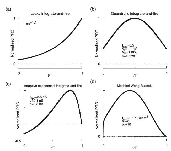 Figure 1. Prevalence of sharp jumps in the PRCs in some neuronal models. (a) PRC of leaky integrate-and-fire neuron model: dV/dt= Iapp - V where V is reset to 0 when it crosses a threshold level of 1 (in normalized units). (b) PRC of quadratic integrate-and-fire neuron model: τ dV/dt=Iapp + V2 where V is reset to Vr when it crosses a threshold level Vth. (c) PRC of adaptive exponential integrate-and-fire model: Cm dV/dt = Iapp - GL (V - EL) + 2 GLe(V+50)/2 - w, τw dw/dt = a (V - EL) - w such that V and w are reset, respectively, to Vr and w+b whenever V reaches a peak level V*. The parameters are Cm=0:1 nF, GL=0:01 µS, Vr = -60 mV, V* = -20 mV, EL = -70 mV, and τw=100 ms. The level of adaptation is controlled by a. (d) PRC of Wang-Buzsáki model that is described in the Model section. Models in (a, b, d) have no adaptation and their second and higher order PRCs are identical to that of the first order.