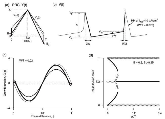 Figure 2. Piecewise linear models of PRC and voltage, and illustration of spike width effect. (a) Sample piecewise linear PRC profiles studied. (b) Voltage time course that consists of three piecewise linear profiles, modeled after the classic Hodgkin-Huxley model. (c) Growth function G(φ) computed for the three PRCs displayed in (a) and the voltage time course in (b). The sharp drops of the PRC at the edges altered the stability of synchrony. (d) Bifurcation diagram as a function of the normalized spike width at B=0:5 and B2=0.25. In this and later figures, solid lines indicate stability and open circles instability of the phase-locked solutions. Synchrony is unstable at all frequencies, whereas antisynchrony is stable at high frequencies.