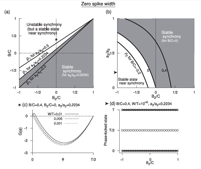 Figure 3. Edge effects when spike width is zero (a) Stable synchrony (shaded region) and the unstable synchrony (white region) for a3/a2=0:2234 in the plane of B2/C and B/C. Boundary curves for two other levels of a3/a2 are also shown. (b) Same as in (a) but in the plane of B2/C and a3/a2 for B/C=0. Boundary curves for two other level of B/C are also displayed. These curves are obtained by inverting equation ρ1 for a3/a2. Antisynchrony is unstable in the displayed parameter ranges in (a) and (b). (c) Growth function G(φ), in the limit of zero spike width, displaying unstable synchrony but a stable phase-locked state that is very close to the synchronous state for a parameter value that is in the unstable synchrony region. (d) One-parameter bifurcation diagram as a function of B2/C.