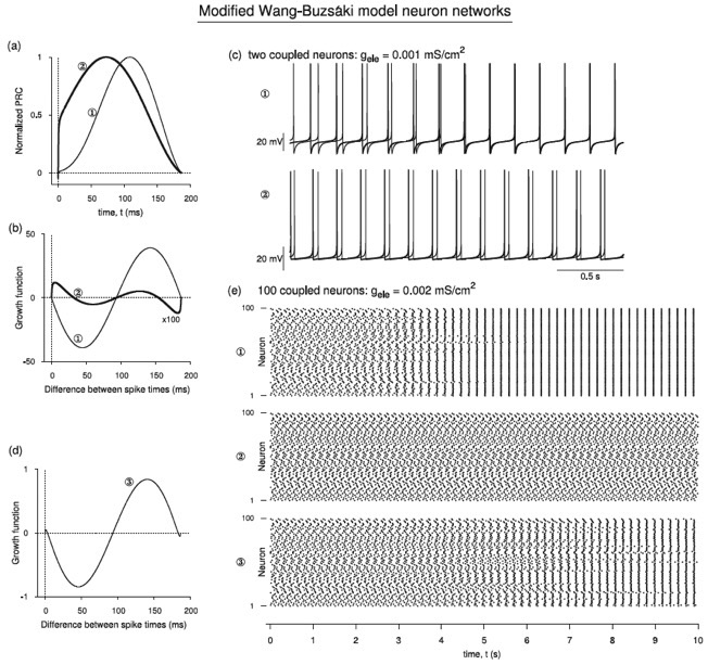 Figure 6. Effect on network behavior emerging from different PRC shapes. Modified Wang and Buzsáki model neurons are used to compute PRCs at two parameter sets (a) resulting in a PRC that is nearly symmetric, and another that has very steep rise near small phases. (b) Growth functions corresponding to the PRCs in (a). (c) Voltage time courses of two coupled model neurons corresponding to the parameter sets of the two PRCs in (a). (d) Growth function for a third parameter set resulting in a non-zero phase-locked state near synchrony. (e) Spike times (plotted as dots) of a network of 100 all-to-all coupled model neurons for the three parameter sets corresponding to the curves in (b,d). The non-zero phase-locked state near synchrony leads to prolonged transients, and a jitter in the spike times in the steady state. 1 : φn=2, Iapp=0.17791 µA/cm2. 2 : φn=9, Iapp=0.17 µA/cm2. 3 : φn=8.3, Iapp=0.172536 µA/cm2. φh is fixed at 5 for all the three sets.