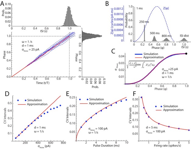 A. The relationship between phase trajectories, phase distribution at the mean spike time, and the distribution of interspike intervals. Ten example phase trajectories are shown in blue. The red line is the mean of 5000 trajectories. The distribution of phases at the firing time (average phase =1) is shown in the histogram to the right of the trajectories and the histogram of interspike intervals is shown above. B. The evolution of the phase distribution for 5000 trajectories like the ones in A. The mean moves at the drift rate ω but the variance increases depending on the phase resetting curve Z (shown in blue). The variance of the interspike interval distribution is the same as that of the phase distribution at the firing time, scaled by 1/ω2. C. The evolution of the standard deviation of the phase distribution (blue line) for the Monte Carlo simulation of the phase neuron, and the Ermentrout et al. approximation to that evolution (red line). The large black dot is the standard deviation of the interspike intervals (for mean firing rate of 1 spike/s). The approximation for standard deviation of phases is shown in the inset. D-F Effect of noise amplitude, pulse duration, and baseline firing rate on the coefficient of variation of interspike intervals in the Monte Carlo simulation (blue points) compared to the prediction of the approximation (red line).