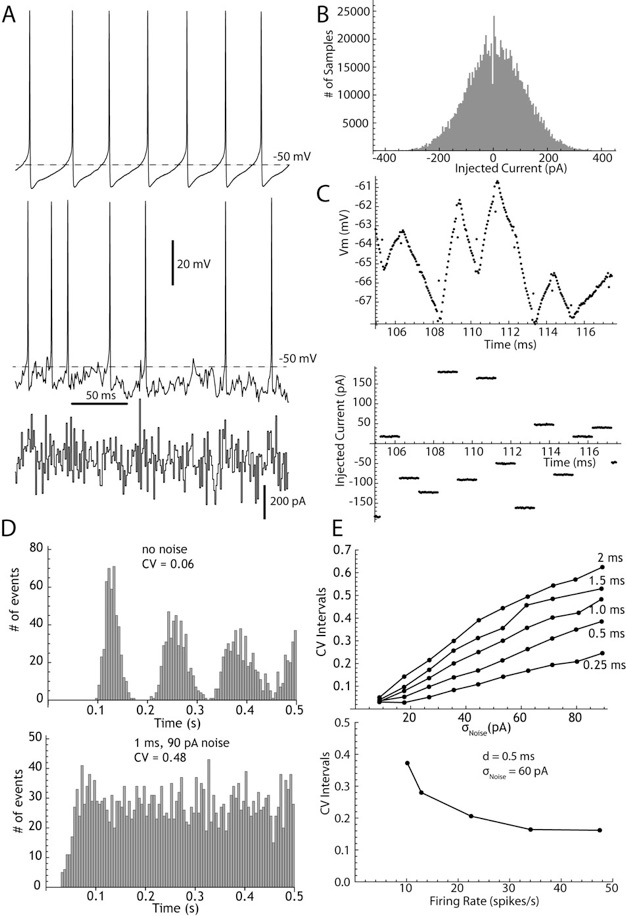 A. Autonomous firing of a STN neuron recorded in the absence of injected noise (upper panel) and in the presence of contiguous 1 ms current pulses (middle panel). The current injected is shown in the bottom panel. The standard deviation of the noise in this example was 90 pA. Average firing rate was unchanged. B. Histogram showing the distribution of noise pulse amplitudes. C. Higher resolution of the injected current (lower panel) and the membrane potential response to currents (upper panel) in the same cell. The capacitative transient at pulse onset and offset is restricted to a single sample (0.05 ms), the membrane changes are almost entirely capacitative and series resistance is well-compensated. D. Changes in regularity of firing during application of the same noise shown in A -C, as indicated by the autocorrelation histogram in the absence (upper panel) and the presence (lower panel) of noise. E. An example showing dependence of interspike interval CV qualitatively similar to those predicted from the phase model, for noise amplitude, pulse duration and baseline firing rate.