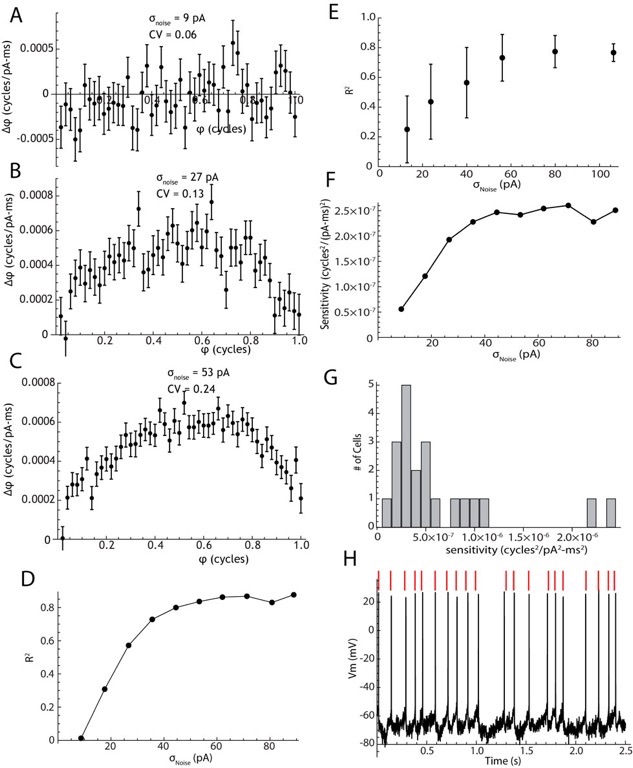 A-C. Examples of phase resetting curves calculated in a single neuron for σNoise from 9 to 50 pA. The estimate of the PRC improves as σNoise is increased, up to about 50 pA, and then is stable. D. The proportion of ISI variance accounted for by the injected noise (R2 for the regression) increases and then stabilizes near 80%. E. For the group of 21 neurons tested, the proportion of the ISI variance accounted for by the noise follows a similar profile. Noise levels of 60 pA and above were equivalent, with ~ 80% of the ISI variance being predicted by the phase model interacting with the injected noise. F. The measurement of Sensitivity (integral of the square of the PRC) increases in parallel with R2, and is constant at higher levels of injected noise. G. Histogram of Sensitivities for neurons in the sample. H. The phase model predicts spike times with high accuracy. A sample of intracellular recording is shown, with action potentials times predicted by the phase model shown by dashed red lines.