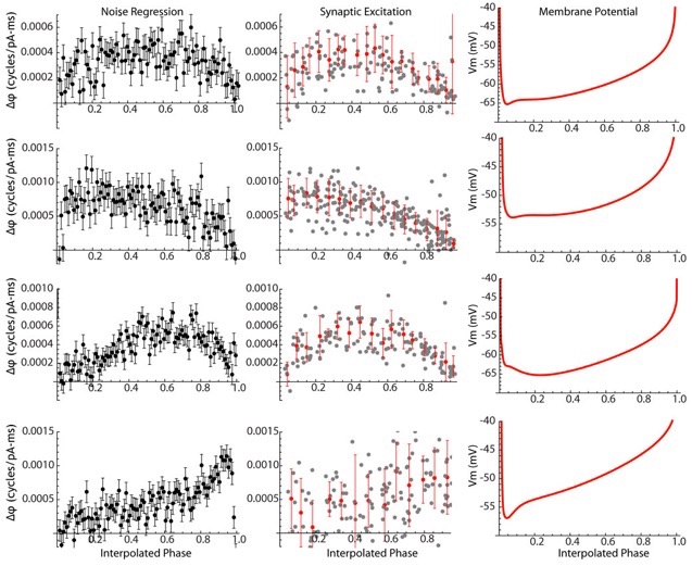 Phase resetting curves calculated by noise regression are in the left column. The phase resetting curve obtained using synaptic stimulation is shown in the center column, and the phase-normalized average interspike membrane potential trajectory is shown in the right hand column. Phase resetting curves measured in the two ways are similar, and are associated with differences in the average membrane potential trajectories.