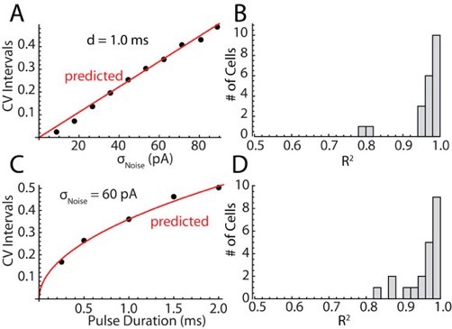 Figure 5. Prediction of CV in STN neurons with changes in noise amplitude and duration.