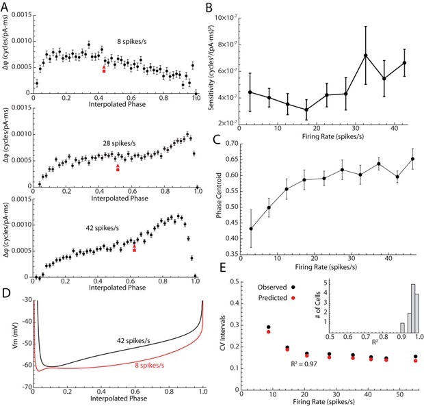 A. PRCs calculated for a single STN neuron at three different rates. In all neurons, large increases in firing rate by injection of constant current resulted in a shift of the peak of the PRC to later phases, and an increase in the overall amplitude of the PRC. Centroids of the PRCs are indicated by red arrows. B. The changes in mean Sensitivity (integral of the square of the PRC) with changes in current imposed by constant current injection for the sample of 12 neurons. C. Average phase centroid versus mean rate in the same sample. D. Changes in average interspike interval membrane potential trajectory with rate in the same cell shown in A. E. Fit of the phase neuron approximation for CV for the same neuron, based on the experimental value of the PRC sensitivity for each firing rate. Inset is the histogram of R2 for the fit obtained for each cell in the sample.