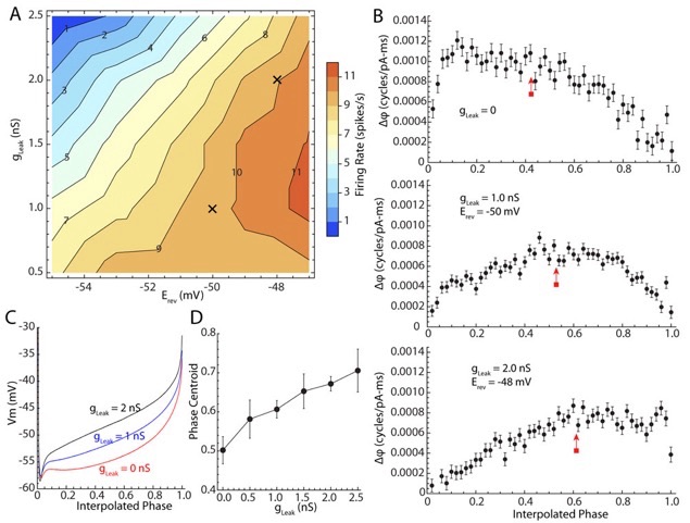 A. Contour diagram of firing rate varying conductance clamp-applied somatic conductance at a range of subthreshold reversal potentials. X marks two rate-neutral points at 1 and 2 nS conductance levels. B. PRCs calculated at the with rate-neutral applied conductances marked in A. Centroids of the PRCs are at the red arrows C. Membrane potential trajectories corresponding to the PRCs shown in B. D. Average (and standard errors) of the PRC centroid for 9 neurons tested with varying but rate-neutral values of gLeak.