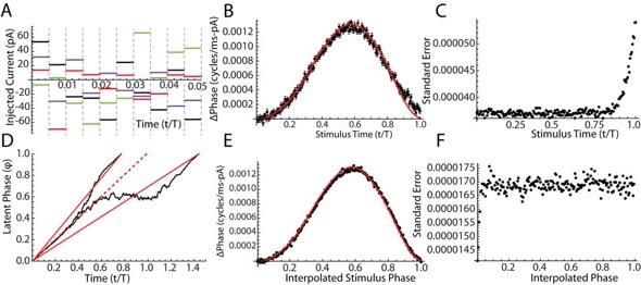 A. The use of pulsed noise provides a natural set of independent stimuli at each time slice (corresponding to pulse duration) during the ISI. Different ISIs are indicated by different colors. B. The PRC and its standard errors calculated by multiple regression on a Monte Carlo simulation using fixed time steps and phase interpolation based on the mean ISI. The true PRC used by the simulation is shown as a red line. Note the consistent error near the end of the PRC. C. The standard error of the PRC estimates as a function of phase. The error increases dramatically at large phases. D. The strategy for phase interpolation. Two phase versus time trajectories from the Monte Carlo simulation used in B and C are shown in black. One is the trajectory a very short ISI, and one for one of the longest ISIs in the simulation. The linear phase versus time estimate used for calculating the phase of current pulses based on mean interval is shown as a dotted red line. This estimate is good at early times in the ISI but fails at longer times. The phase interpolations we employed is shown as solid red lines. Although less accurate at short times they are more accurate later, at times when the PRC values are higher and the noise is more influential. E. The PRC calculated using our interpolation method, overlaid by the true PRC for the simulation (red). F. The standard error of the estimates of the PRC in E. Note lower overall error, and the even distribution of error across the ISI.