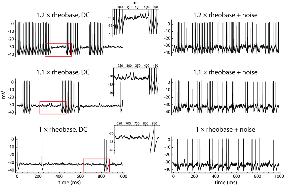 Figure 1. Effects of DC and noise on stuttering. The steady-state firing of a typical striatal FSI is shown at three DC levels, each without noise (left) and with noise (right). Increasing the DC level produced longer spike runs, whereas noise disrupted the runs and pauses. The insets show the noisy subthreshold oscillations observed during pauses (expanded from the red boxed regions).