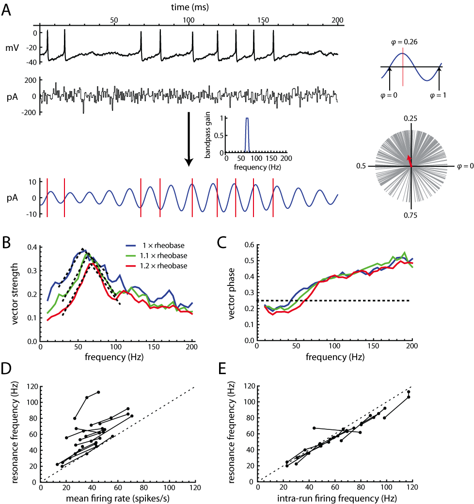 Figure 2. Analysis of spiking resonance. A. Example of spike response to a noise stimulus, showing an individual frequency band (fcenter = 70 Hz, bandwidth = 10 Hz) extracted from the stimulus using a Tukey window function (inset; see Materials and Methods). Red vertical lines indicate the alignment of each spike on the stimulus component. Upper right inset shows the convention for assigning spike phases with respect to a stimulus component. Lower right inset illustrates the vector representation of spike phases. Red arrow is the vector average (resultant vector), and its length is the vector strength (VS). B. Spectra of VS with respect to each frequency component of the stimulus, at each mean current. The black dashed lines indicate the bilinear fit used to measure the resonance frequency and strength at each DC level. C. Spectra of vector phase. D. Resonance frequency vs. mean firing rate. The lines connect data points obtained from the same cell at different DC levels. E. Resonance frequency vs. intra-run firing rate (reciprocal of the mode of the ISI distribution).