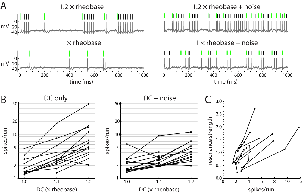 Figure. 3. Analysis of run length. A: identification of spike runs, defined as sequences of spikes separated by interspike intervals (ISIs) 1.5 times the mode of the ISI distribution. Green marks indicate the first spike in each run. B: effect of direct current (DC) on mean run length in each cell, without noise (left) and with noise (right). Data are from the steady-state portion of each stimulus. Lines connect data points from the same cell at each DC level. Note the consistent increase in run length with more DC and the shortening of runs by noise, particularly at the higher DC levels. C: resonance strength, defined as VS(fres)/VS(0.5fres) 1 (where VS is vector strength and fres is resonance frequency), vs. mean run length. Note the increases in resonance strength with run length in the individual cells, as well as the overall correlation across all cells and DC levels (r=0.60).