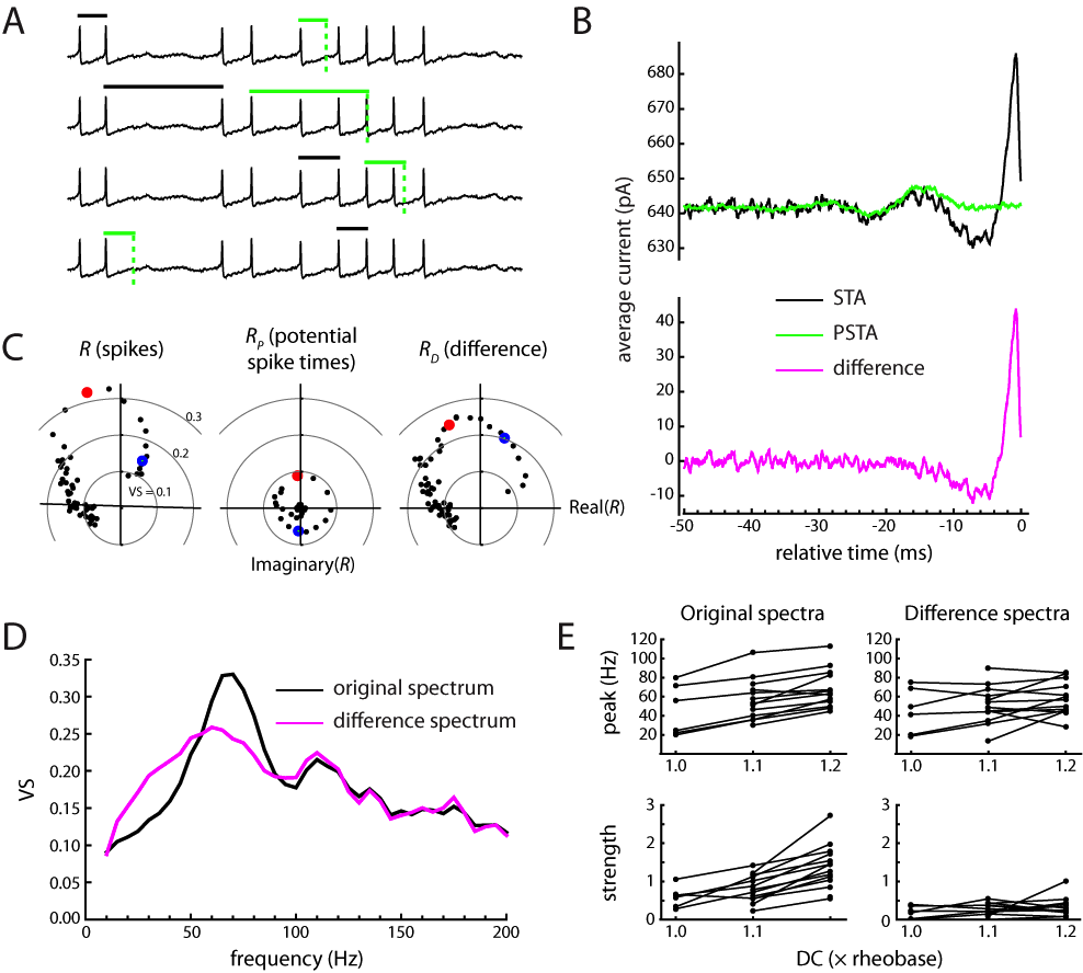 4. Contribution of sequential spikes to spiking resonance. A. Method for analysis of potential spike times. Each trace shows a randomly chosen ISI (black bar) added to a randomly chosen spike time (green bar) to give a potential spike time (green dashed line). B. Top: example of spike-triggered average current (STA, black line) compared to potential-spike-triggered average current (PSTA, green line). The PSTA has a lower noise level than the STA because 10 potential spike times were chosen for each actual spike time. The PSTA matches the early portion of the damped oscillation seen in the STA. Bottom: difference between the STA and the PSTA. Only the fast transient and one preceding negative excursion remain in the difference current. C. Polar plots illustrating the analysis of spiking resonance for the actual spike times (left) and the potential spike times (middle), and the vector differences (right). Each point represents a resultant vector measuring the phase distribution with respect to one frequency component of the stimulus. The magnitude of the vector is the vector strength (VS, distance from the origin), and the angle of the line connecting the point to the origin is the vector phase. The illustrated data were obtained at a DC level of 1.2 ´ rheobase. Red and blue symbols indicate the 70 Hz and 35 Hz frequency components, respectively. D. Original VS spectrum and difference VS spectrum from the data in C. The sharper, higher peak seen in the original spectrum compared to the difference spectrum indicates that sequences of spikes contributed to spiking resonance. E. Summary data comparing the peak frequencies (top plots) and resonance strengths (bottom plots) for the original VS spectra to the corresponding results for the difference spectra. The data show that spike sequences contributed to the change in resonance frequency associated with increasing DC, and were largely responsible for the increase in resonance strength.