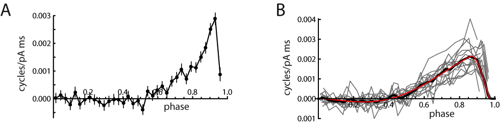 Figure 5. The phase resetting curve (PRC). A. Example PRC computed from the perturbation of intra-run ISIs in a FSI (see text for details). The PRC shows a very slight negativity for phases up to approximately 0.5, followed by a much larger positive phase that falls off abruptly at the right side. This PRC shape indicates that stimulus current arriving in the late portion of each ISI was primarily responsible for changes in ISI length. B. PRC data from 14 FSIs, each at a DC level of 1.2 ´ rheobase (gray lines), the average PRC (black line), and a composite function fitted to the average PRC (red line; see Materials and Methods). The fitted curve was used for the simulations described below.