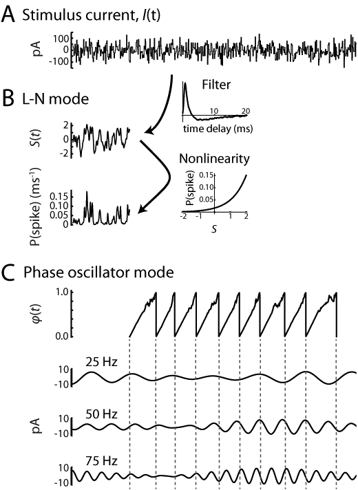 Figure 6. Simulating spike runs. The figure illustrates the generation of one spike run. A. Noise current providing input to the model. The DC current was incorporated in the baseline firing rate of the model and does not appear explicitly. B. For simulation of each spike run, the model starts in the linear-nonlinear (L-N) mode, which represents the cell in the paused state. The noise current is convolved with a linear filter (top inset) to produce a filtered stimulus variable S(t). The linear filter was constructed as the time-reversed, average difference STA (see Fig. 4B) from 14 cells. The value of S is transformed to spike rate by an exponential nonlinearity (bottom inset) with parameters chosen to account for the mean pause lengths observed without and with the noise current. The model remains in the L-N mode until a spike is produced by a rate-modulated Poisson process. C. Phase oscillator mode. Upon producing the first spike, the oscillator is initialized at 𝜑 = 0, representing the post-spike reset. The phase 𝜑(t), then advances at a rate ω + I(t) Z(𝜑), where ω = 50 Hz and Z(𝜑) is the fitted average PRC. The subsequent spike times are indicated by the resets from 𝜑 = 1 to 𝜑 = 0. For analysis, the spike times are aligned with the frequency components of the noise stimulus.
