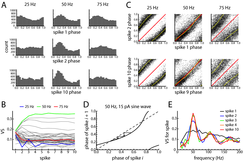 Figure 7. Evolution of entrainment across simulated spike runs. A. Model spike phases with respect to the 25 Hz, 50 Hz, and 75 Hz bandpass components of the stimulus. The 50 Hz component matches the oscillation frequency (ω) of the phase-oscillator model. Top row shows the phase distributions for the first spikes, produced by the L-N component of the model, and the second and third rows show the distributions for spikes 2 and 10. The modulation of spike probability was initially similar for the three frequencies, but progressively strengthened at 50 Hz and weakened at 25 and 75 Hz. B. VS versus spike number for each frequency. The VS values approached steady-state by spike 5. For the resonant frequency (50 Hz, green line) the approach to steady state was approximately exponential, whereas for some other frequencies (i.e. 25 Hz, blue line) the VS alternated between higher and lower values before steady state was attained. C. Maps of sequential spike phases (top, spike 2 vs. spike 1; bottom, spike 10 vs. spike 9). Black dots indicate spike phases during the noise stimulus. Yellow line is the deterministic map for a pure sine wave input matching the average frequency and amplitude of each bandpass frequency component. The identity line is shown in red, and the point where the deterministic map intersects the identity line from top to bottom is a stable fixed point. During the runs, the spike phases are attracted toward the stable fixed point for the 50 Hz stimulus component. In contrast, there is no fixed point for the 25 and 75 Hz components, and the spike phases disperse as the runs proceed. D. Illustration of the entrainment process for a single 50 Hz sine wave input of larger amplitude, showing how sequential spike phases evolve toward the fixed point. E. VS spectra for spikes 1, 2, 3, 4, and 10. The spectral peak was relatively broad for spike 1 and progressively sharpened, producing clear first and second harmonic peaks.