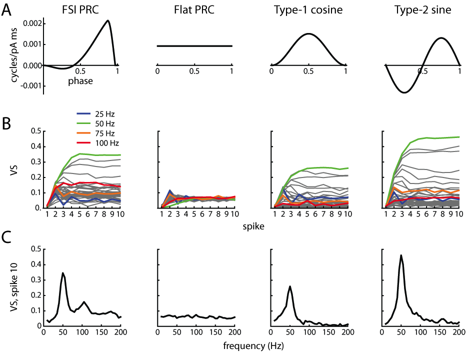 Figure 8. Entrainment simulated with different PRC shapes. Spike runs were simulated as described above, except that the initial spike times were chosen randomly without using the L-N model component. A. PRC shapes used for simulations: the mean FSI PRC (used for Fig. 7), a flat PRC representing a perfect integrator, a type-1 (always positive) cosine function, and a symmetrical type-2 (negative and positive) sine function. B. Vector strength versus spike number. In each case the VS for spike 1 is low because the spike times were random, giving random initial phases. For the three shaped PRCs, frequency-selective entrainment developed across the runs. In contrast, with the flat PRC, the VS approached a small value that was similar for all frequencies. With each PRC, the VS levels approached steady state around spike 5. C. VS spectra for spike 10. Each of the three shaped PRCs produced a peak at the frequency of the phase oscillator (ω = 50 Hz), but only the FS PRC generated a second harmonic peak. In addition, the FS PRC produced higher VS at frequencies above the second harmonic.