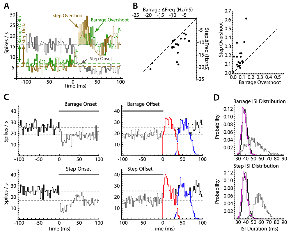 Figure 4. Peristimulus time histograms for inhibition and disinhibition. A. Example histograms for onset of step inhibition (gray), and for disinhibition at the offset of the step (brown) or barrage (green), showing the measurements used. The firing rate during the pause (in the absence of inhibition) is indicated by the gray histogram for negative times, and its average (baseline firing rate) is the gray dotted line. The steady-state firing rates during the barrage and step are the averages of their respective histograms for the 100 ms preceding the offset of inhibition (green and brown dotted lines). Average rate changes are labeled Barrage Delta and Step Delta. The changes in rate following the offset of inhibition include a transient overshoot. The overshoots are measured as the integral of the initial region above the baseline firing rate (shaded areas). B. Comparison of the rate changes produced by barrage and step inhibition in 18 neurons. On average, the step inhibition was more effective at changing mean rate (signed rank test, N = 18, p = 0.00028), and produced a larger overshoot (signed rank test, N = 18, p = 0.00046). C. Onset and offset histograms for an example cell. The histograms for the first and second spikes after the offset are shown in red and blue, respectively. These correspond to the first two peaks in the PSTH after removal of inhibition. D. The overshoot is not a change in rate. Interspike intervals for the baseline firing (black), for the interval between the first and second spike after removal of inhibition (purple), and for the steady-state inhibitory period (gray). The interspike interval histogram for the first post-inhibitory ISI did not differ from that of the baseline rate. Thus, the overshoot does not occur because of any change in interspike intervals, but is caused by resetting the oscillation so that the cell is more likely to fire at the same time on each trial. There was no significant difference between the intervals between the first and second post-inhibitory spike and the mean baseline interspike interval for the sample of 18 neurons (signed rank test, p = 0.62).