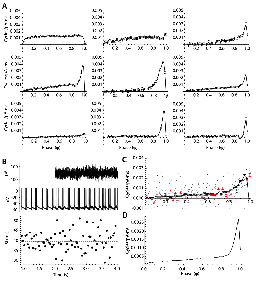 Figure 5. The PRC for SNr cells. A. Examples of 9 (out of 18) SNr neurons showing the range of variation in PRC size and shape among these cells. The error bars are standard errors of the estimates for the PRC values, calculated for 50 different phases in the cell’s firing cycle. B. The noise waveform (top) and the changes in spiking (bottom) used to calculate the PRC. The firing rate in the absence of noise was used to estimate the unperturbed firing rate. The PRC was calculated by regressing the variations in ISI against the amplitudes of the brief noise pulses that occurred throughout the ISI. C. Comparison between PRC for a single cell measured using noise (black) and with 1000 single pulses (red). Responses to single trials are gray points. D. Mean PRC for all 18 cells.