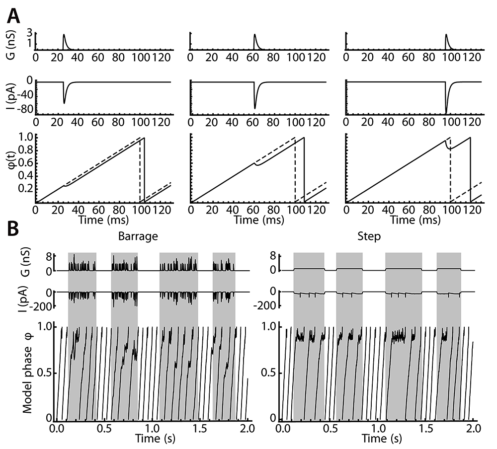 Figure 6. The phase model. A. Example IPSG waveform, synaptic current, and phase trajectories for an IPSG applied at three different times in the interspike interval. At early phases (left), the driving force is small and the PRC amplitude is small, so the effect of the IPSG on spike timing is small. The phase trajectory in the absence of the IPSG is shown as a dotted line. At later phases, the synaptic driving force is larger, so the current increases. The effect of synaptic current is also enhanced by the increased value of the PRC late in the cycle. B. Phase trajectories for a phase model of an example SNr neuron for barrage (left) or step (right) conductance changes. When the inhibitory conductance is present, the cell tends to linger at late phases, where the inhibition is most effective at slowing phase advance. For the barrage stimulus, there are brief times when there are few IPSGs, and during these times the cell escapes inhibition, producing irregular firing. This causes firing to be faster and more irregular during barrage inhibition compared to steps.