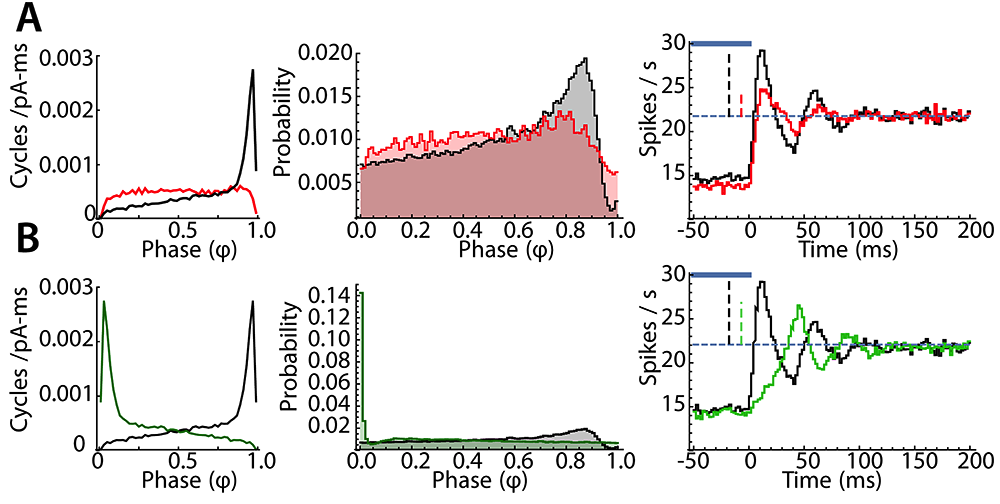 Figure 9. Distortion of the phase distribution and the resulting disinhibition overshoot depend on the shape of the PRC. A. A comparison of two PRCs (left), the probability distribution of phase at the end of the inhibitory period (center), and the disinhibition PSTH (right), for two cell models. One model used the mean PRC for the sample of SNr neurons, which has a large peak at late phases (black), and one was based on the single neuron in the sample with the flattest PRC (red). The late peak in the PRC produced lingering of the cell at late phases, and buildup of phase probability at late phases, which was much less for the flat PRC. The reduced peak in the phase distribution led to a smaller disinhibition overshoot in the PSTH. B. A similar comparison of the effect of PRC skew. A phase model based on the mean SNr PRC (black) is compared with its left-right reversed mirror image (green). During inhibition, the reversed-PRC model produced a slowing of the phase trajectory and a peak in the phase probability at early phases. Upon the termination of inhibition, the peak in phase probability propagated to the right at the cell’s unperturbed firing rate, and produced a disinhibition overshoot almost an entire cycle later. The late disinhibition overshoot was also smaller and less defined, because intrinsic cell noise erodes the peak in the phase distribution as it propagates to the right (Simmons et al. 2018).